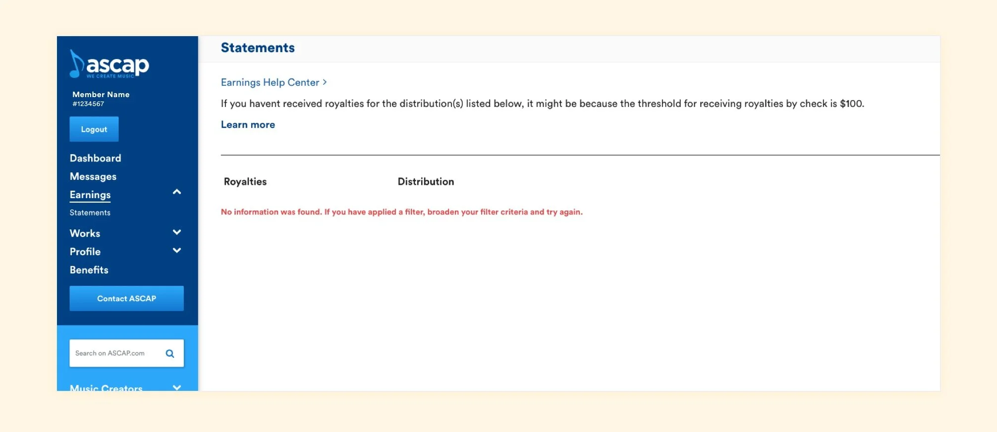The Statements empty state has a similar goal: no registered songs = no royalties = no statements.